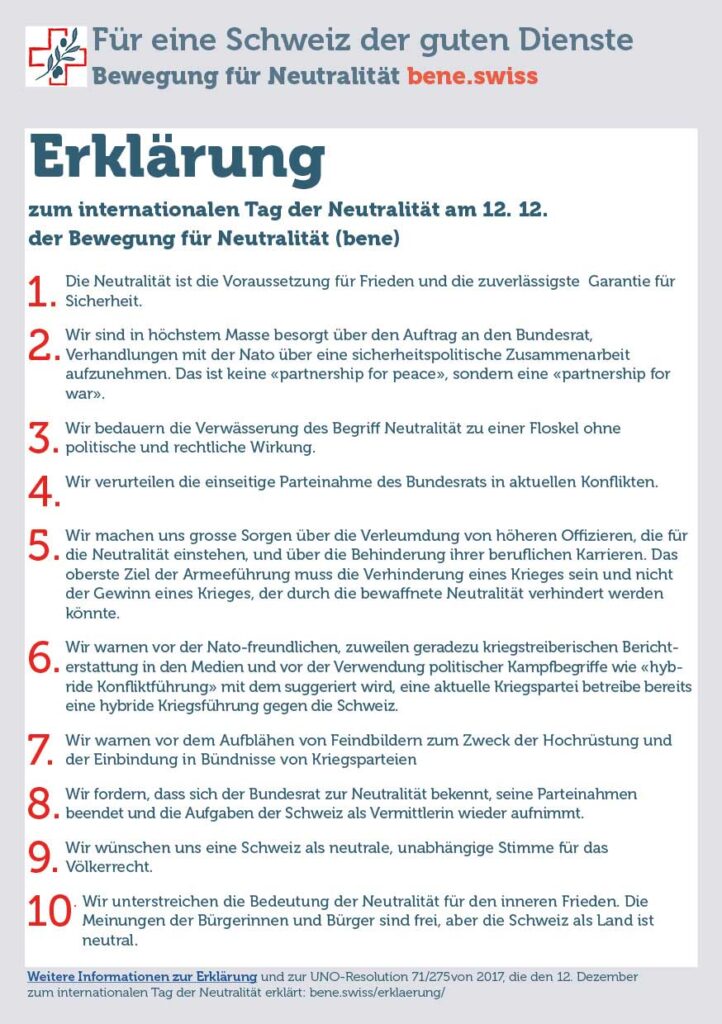 Die Bewegung für Neutralität (bene.swiss) bedauert, dass die offizielle Schweiz, bis vor wenigen Jahren noch der weltweit strahlende Leuchtturm der Neutralität, diesen Tag stillschweigend und tatenlos vergehen lässt und gibt folgende Erklärung ab: